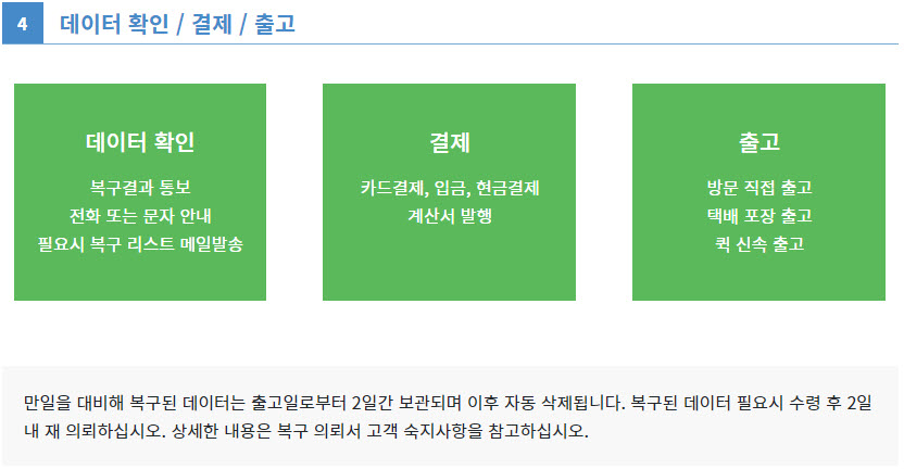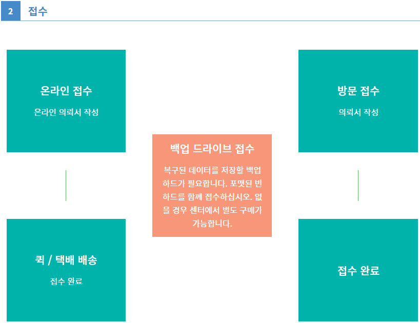 복구의뢰방법/접수절차 접수 방법 by CBL 2020. 2. 10. 데이터 복구 접수절차 안내 온라인 접수 회사소개: https://cbltech.co.kr/pages/cbl/greeting.php접수방법: https://cbltech.co.kr/pages/cbl/apply.php온라인접수: https://cbltech.co.kr/bbs/write.php?bo_table=request_form CBL테크 - 데이터 복구 전문업체 하드디스크 복구, 서버/나스 데이터 복구, 외장하드 복구, 플래시메모리 복구, SSD 데이터 복구, 산업장비 복구, 데이터베이스 복구 cbltech.co.kr 공유하기 게시글 관리 CBL Data Technic 저작자표시 비영리 변경금지 (새창열림) 댓글