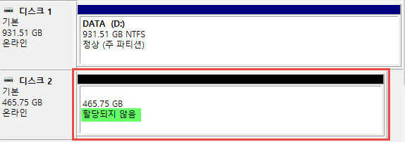 ▲ 파티션이 까맣게 나오고 할당되지 않음으로 출력되면 파티션이 날아간 것이다.