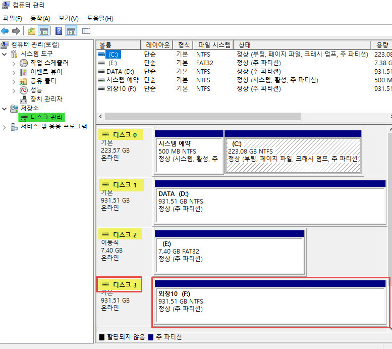 ▲ 디스크 관리를 클릭 - 해당 외장하드의 디스크 정보가 정상적으로 출력되는지 확인하자!