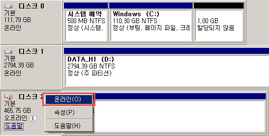 ▲ 해당디스크에 마우스 커스를 두고 우클릭하여 온라인으로 클릭한다.