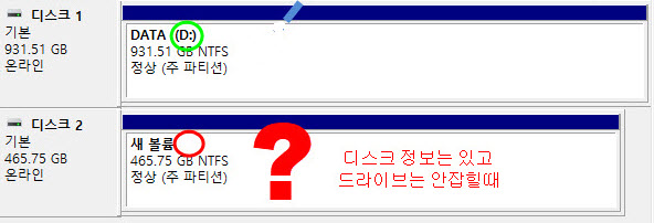 ▲ 디스크가 오프라인 상태에서는 정상적으로 드라이브가 뜨지 않는다.