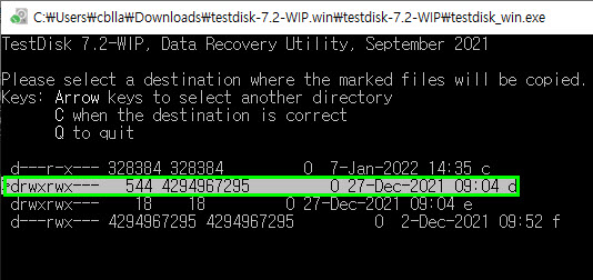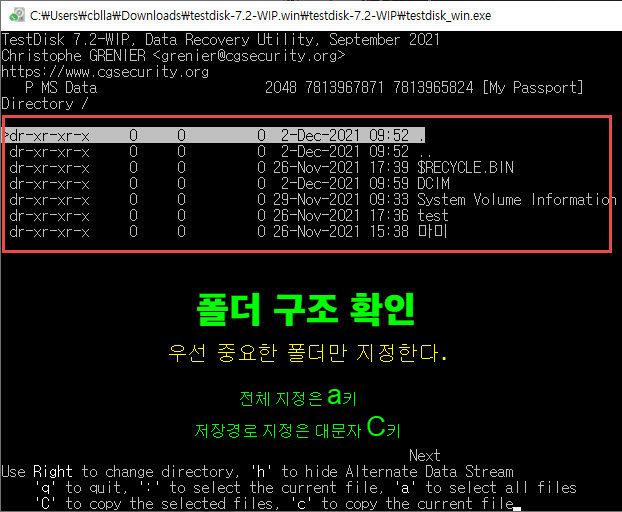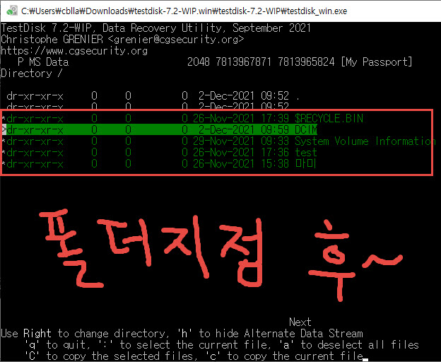▼ 복구 대상 폴더 지정(전체지정은 a키) > 대문자 C키 클릭. (불량난 하드를 지정하면 안됨!)