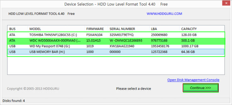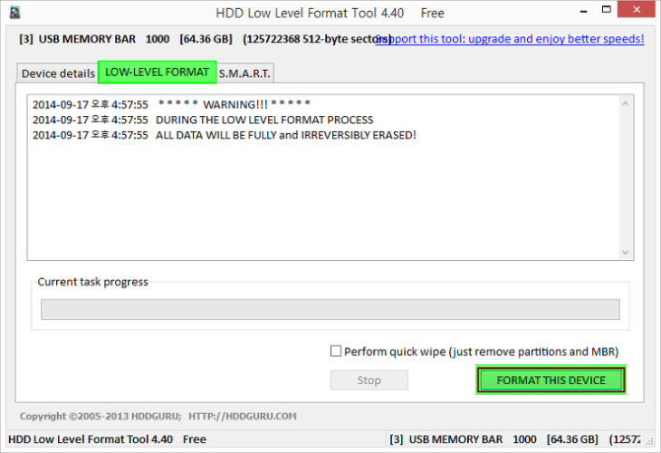 ▲로우레벨포맷 텝을 클릭한후 아래 포맷 디바이스 클릭하면 시작된다.